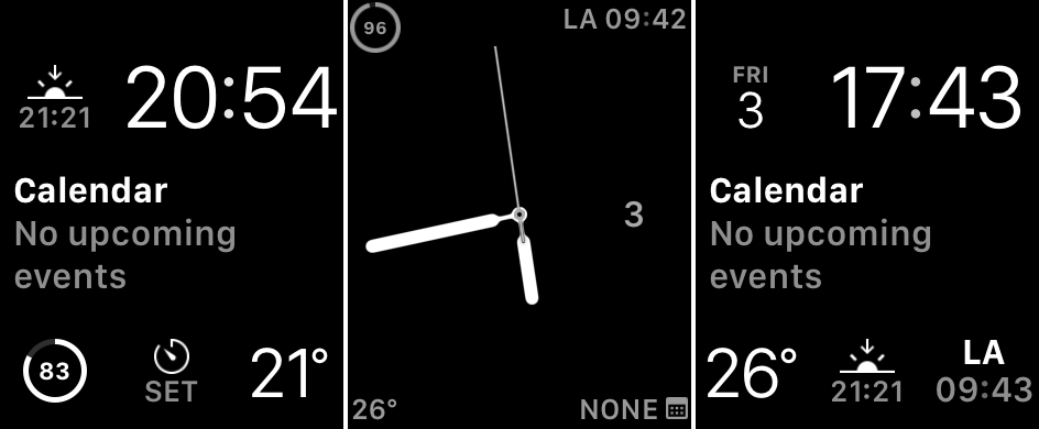 I have three ‘faces.’ Mostly used is my simple face. I like the space on the screen, it feels uncluttered but informative enough at the same time. Then I have 2 modular faces, mainly so I can have my calendar/next event prominent and easy to view at a glance. Main complications are LA time, as the band I work for has management based in LA as well as in London, so I like to easily see when they’re waking up etc compared to my time. It just reminds me nicely when I need it.